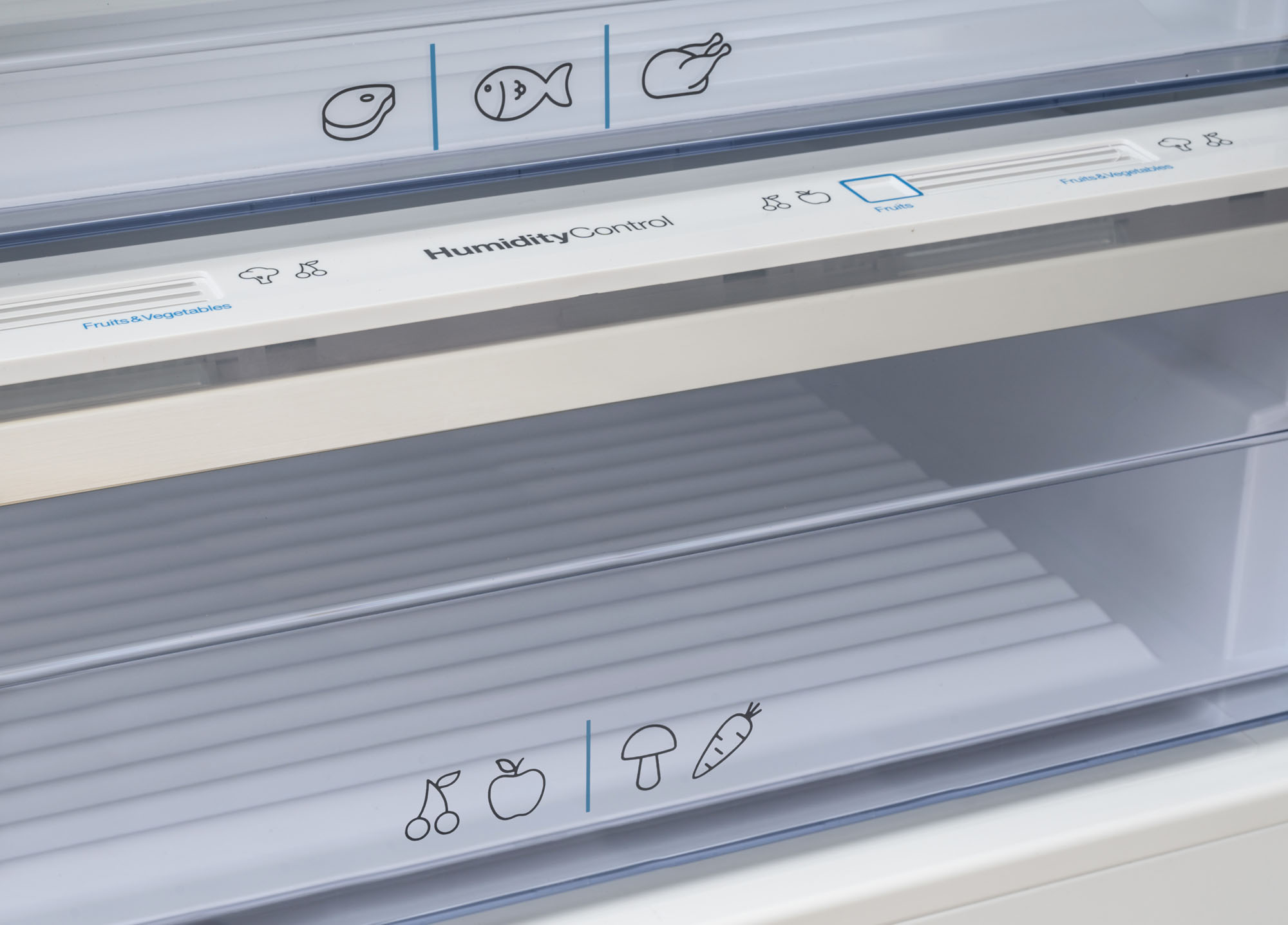 Внутреннее пространство холодильника разделено на несколько зон, чтобы можно было регулировать их расположение в соответствии со своими потребностями. Объем холодильной камеры 344 литра, из них 157 литров занимает зона с температурой 0 градусов, где можно хранить мясо и рыбу, не беспокоясь об их сроке хранения. Следующий выдвижной ящик с контролем влажности и фильтром UltraFresh можно использовать для хранения овощей и фруктов. Внутреннее пространство дополняют 4 полки из армированного стекла, одна из которых разделенная фигурная проволочная полка для напитков в бутылках. Полки в дверях произведены из высококачественного пластика.