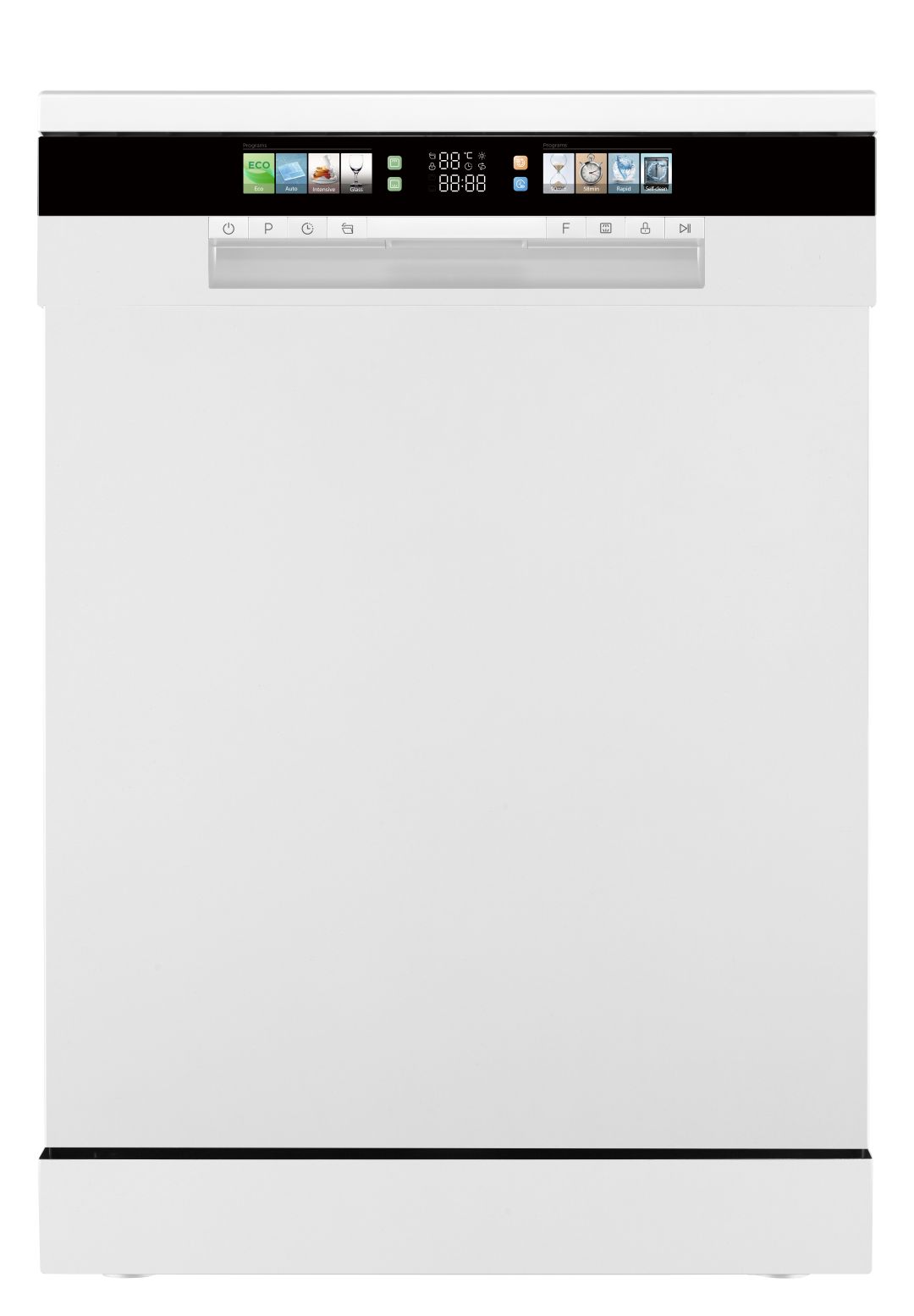 Freestanding dishwasher 60cm, Water consumption per cycle: 9.8 l, Electricity consumption: 65 kWh/100 cycles, Noise level: 42 dB(A) re 1 pW, BLDC inverter motor, Capacity: 14 place settings on 3 levels, Number of programs: 8, Automatic door opening, Interior lighting, Control method: touch, Stainless steel washing compartment, AquaStop, Color: white