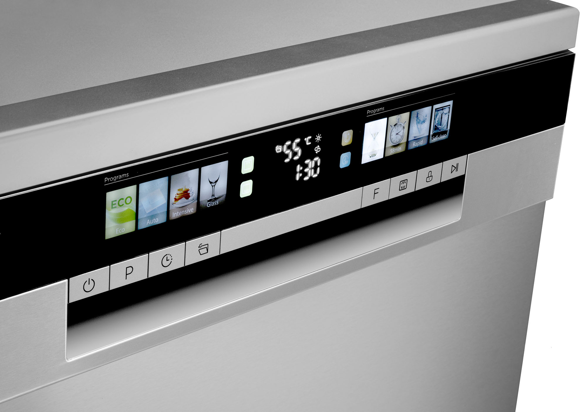 La pantalla LED permite comprobar constantemente los programas seleccionados y facilita la realización de todos los ajustes. Le ofrece información sobre el tiempo restante y le avisa si necesita rellenar sal o abrillantador.