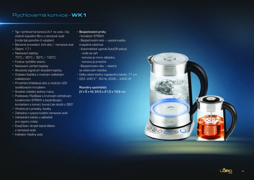Rýchlovarná kanvica 2v1 LORD WK1 v kombinácii skla a nerezu svojim dizajnom rozjasní každú kuchyňu. Veľmi rýchle ohriatie vody v kanvici zaistí príkon 2400 W, takže sa nemusíte obávať dlhého čakania na kávu či čaj. Jednou z najväčších predností je jej veľká kapacita 1,7 l a súčasne vyberateľný filter na čaj. Táto neprehliadnuteľná kanvica WK1 vyniká svojimi funkciami. Ak milujete kvalitný čaj, alebo si radi doprajete lahodnú instantnú kávu, poteší vás funkcie termoregulácie. Teplotu vody si môžete nastaviť na 70 ° C, 80 ° C, 90 ° C alebo 100 ° C. Ďalšou obľúbenou funkciou je Keep Warm, teda udržiavanie horúcej vody v takej teplote, akú si vyberiete.